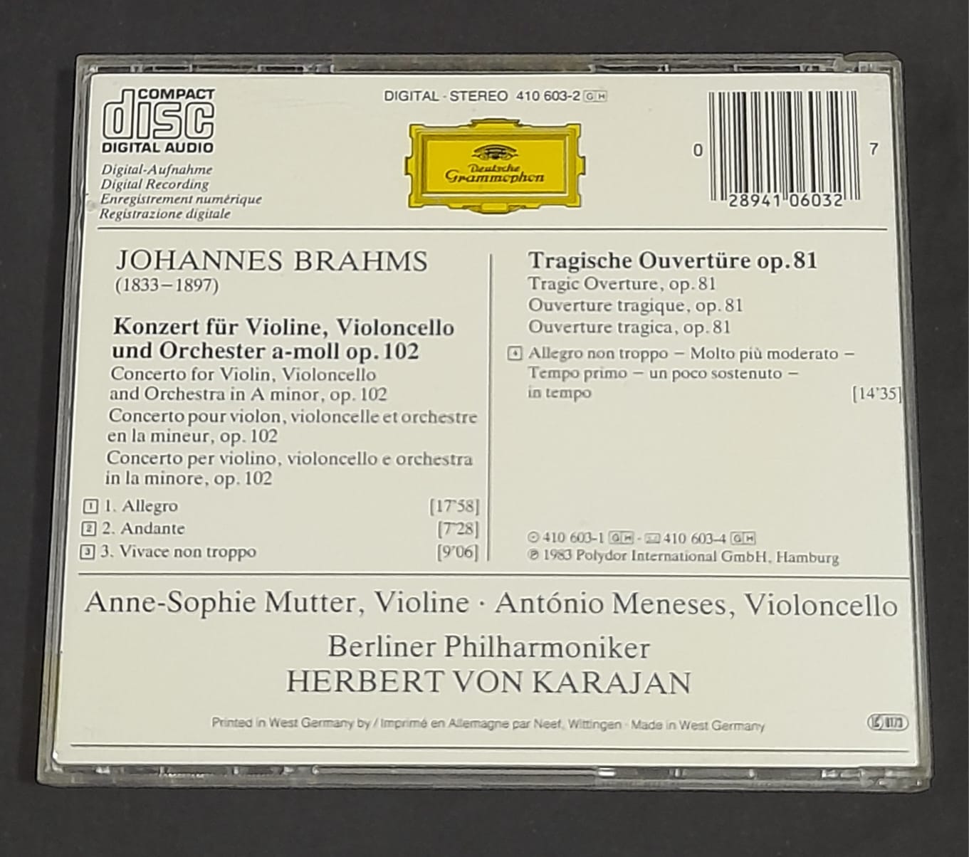 CD Brahms : Doppelkonzert – Double Concerto – Reg: Karajan